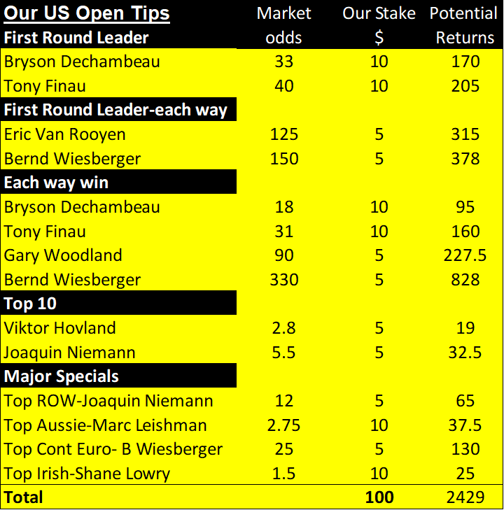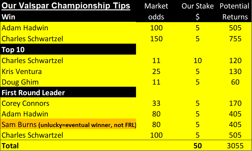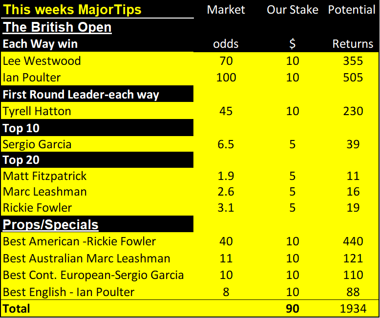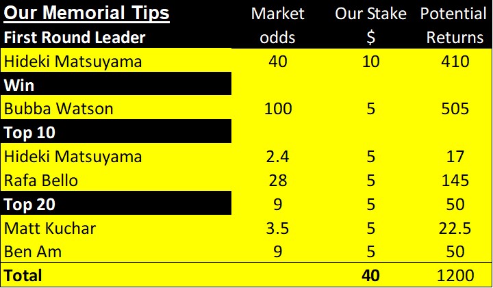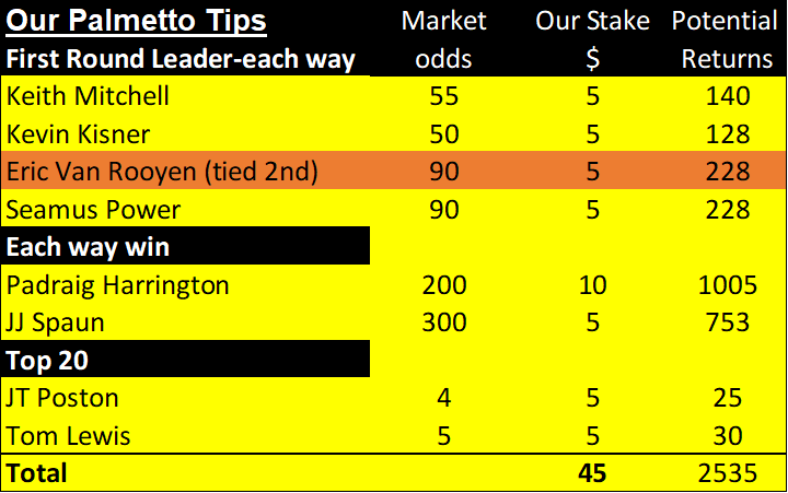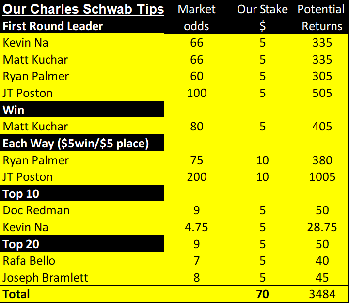 The first chart below shows this week’s golf betting tips.  Then we list all of our weekly golf betting tips for the year to date. In addition, we explain how likely winners are. Finally, you can see our financial record for the year to date here.